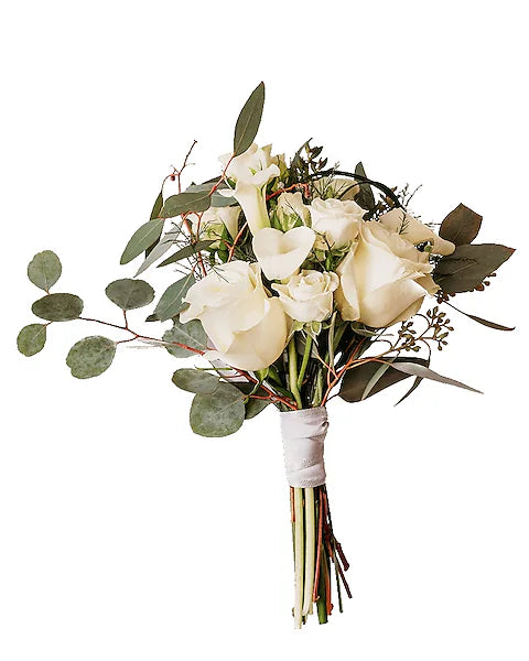 Our Enchanted Evening hand tied bouquet is traditional with white roses, mini calla lilies and eucalyptus all tied together with satin ribbon.