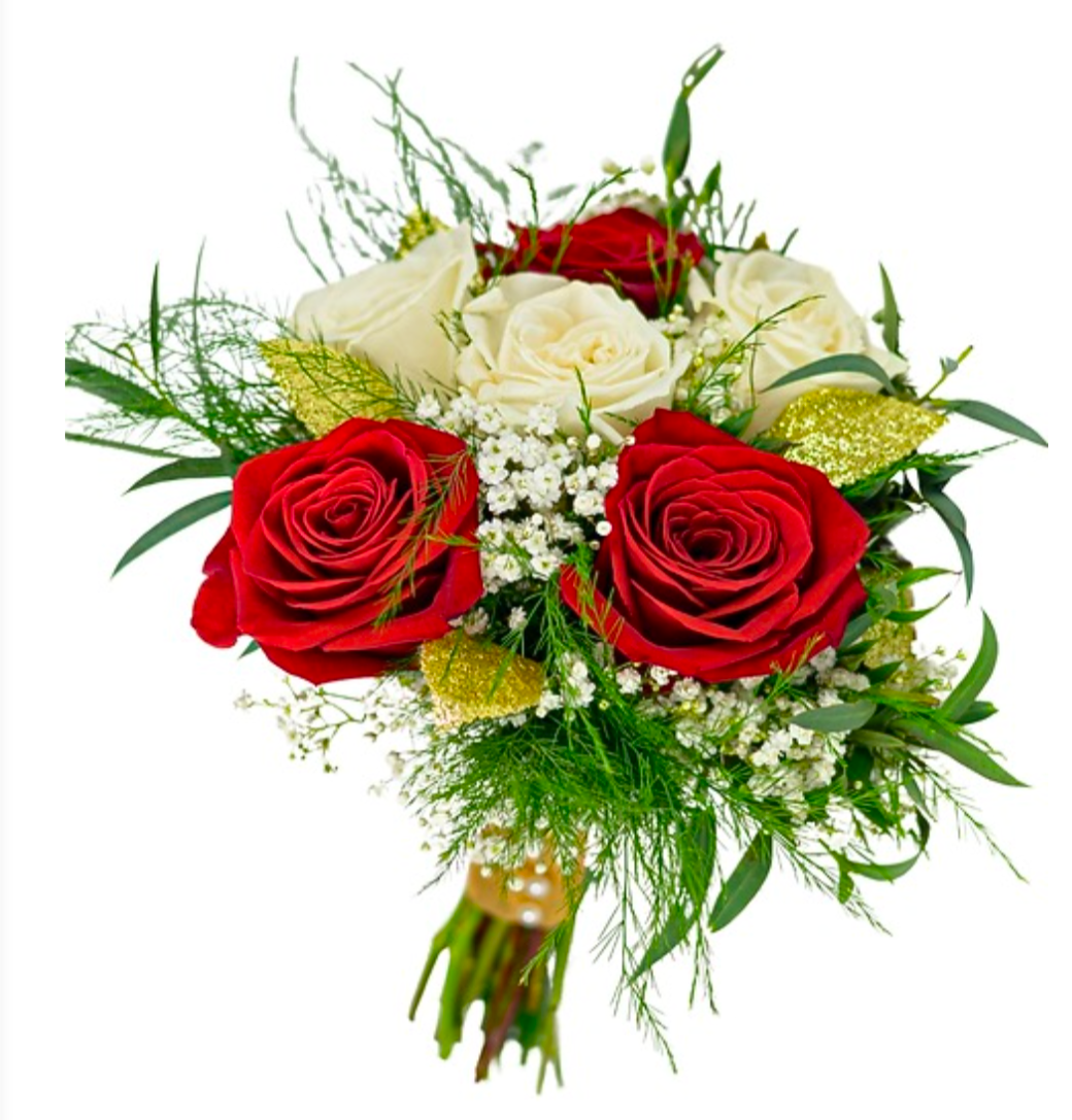 A stunning handheld bouquet designed for prom or homecoming, featuring classic red and white roses accented with lush greenery for a timeless look.