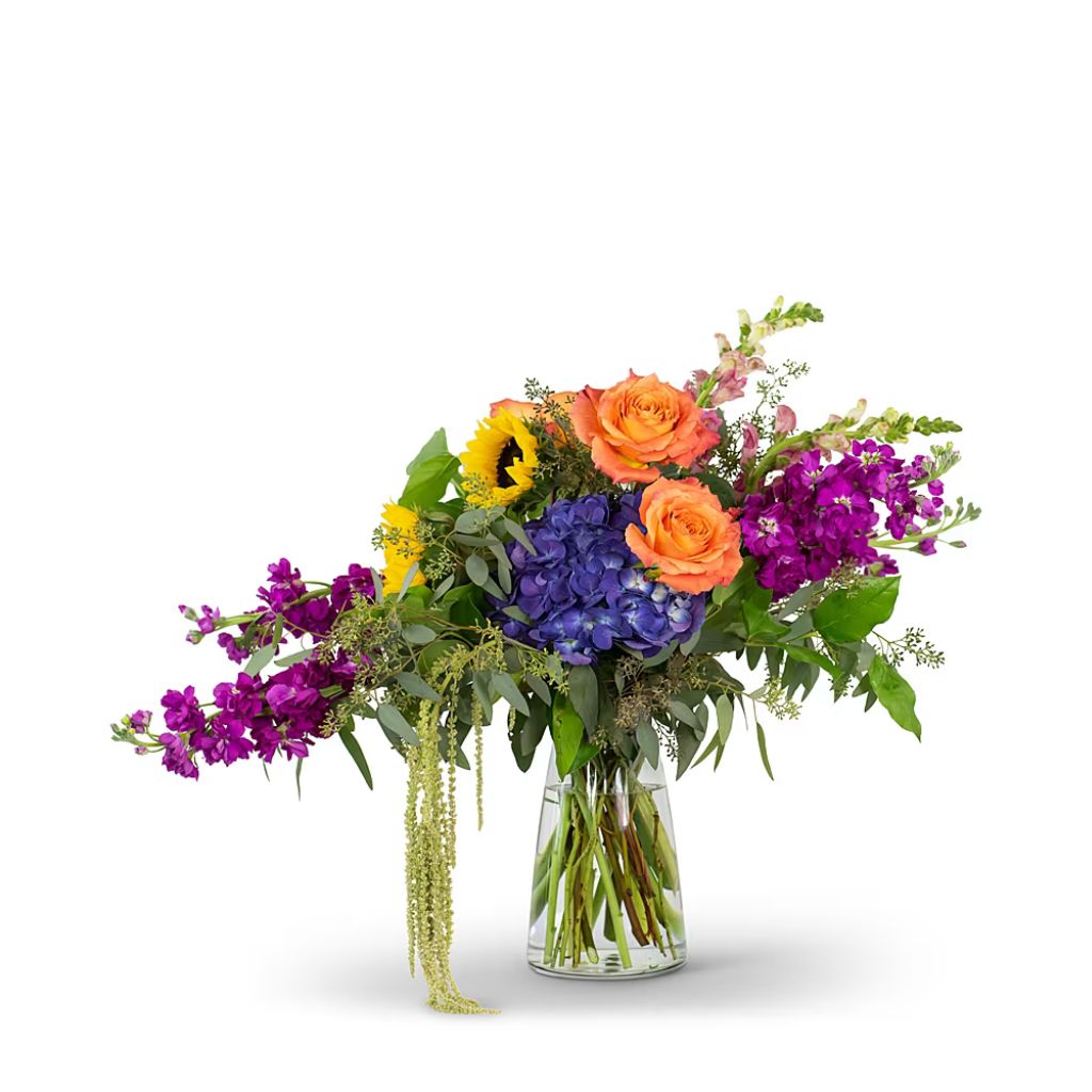 The Naturally Prismatic Vase is a burst of color and brings joy with its vivid array of color. Artfully designed in a glass vase are Snapdragons, Stock, Hydrangea, Sunflowers and Roses.