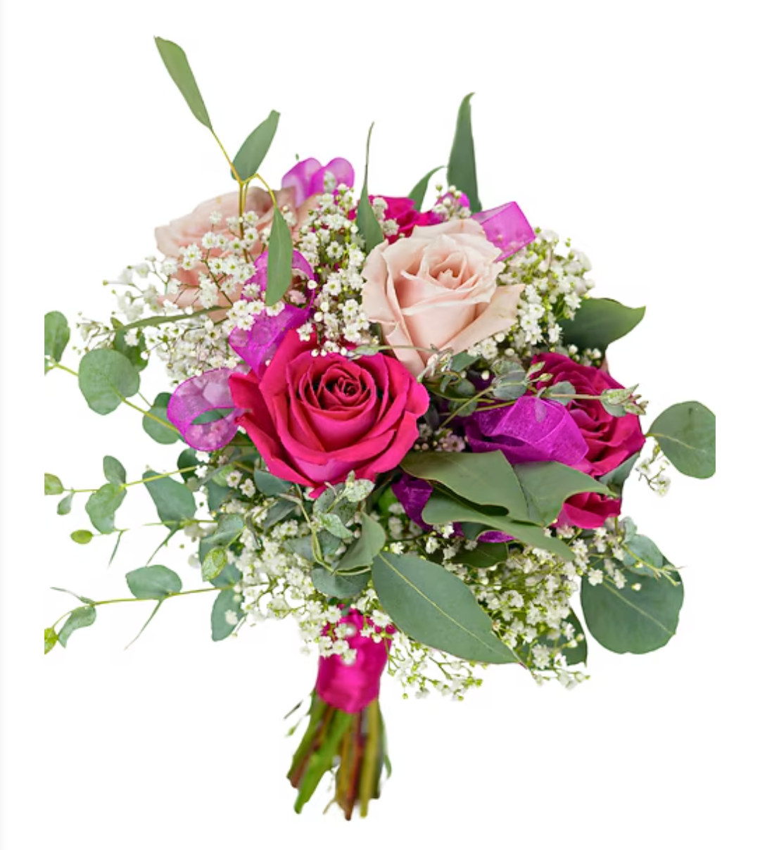 Make prom or homecoming unforgettable with this handheld bouquet of dark and light pink roses, styled with greenery for a sweet, picture-perfect look.