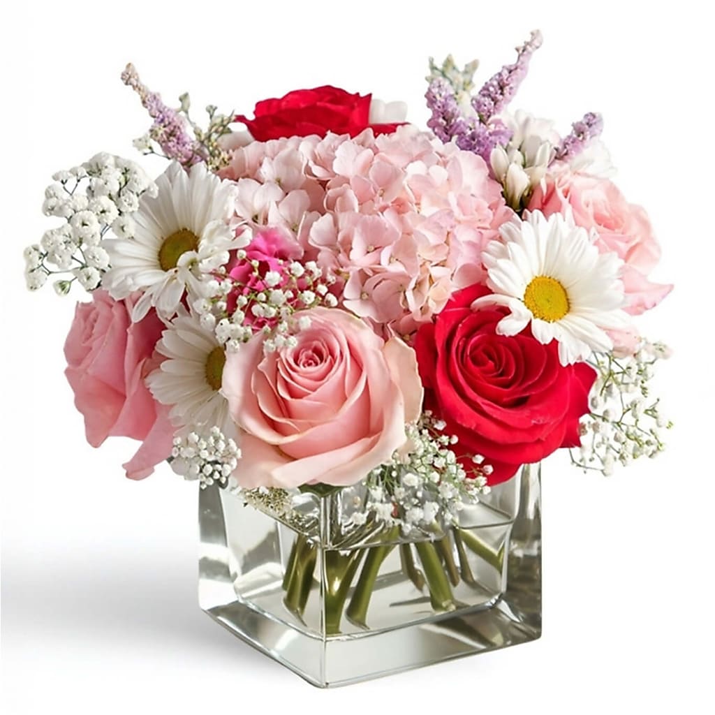 Soft, delicate, and full of sentiment, Whispered Promises speaks from the heart with gentle pink hydrangeas, blushing roses, and charming daisies. This compact, romantic design in a sleek cube vase is perfect for expressing heartfelt love with timeless elegance.